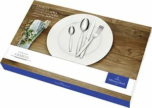 Den eleganta Charles bestickskollektionen har tydliga linjer och starka kanter. Det diskmaskin-säkra bestick i rostfritt stål finns i en vacker och praktisk kartong med en bild av produkten. Det attraktiva och robusta Charles-besticket är en riktig allrounder. Detta bestick för sex personer är perfekt för speciella tillfällen och lägger en speciell touch till dina vardagsmat. Servera som proffsen med Charles. Uppsättningen består av 6x skedar 6x gafflar 6x knivar 6x kaffeskedar