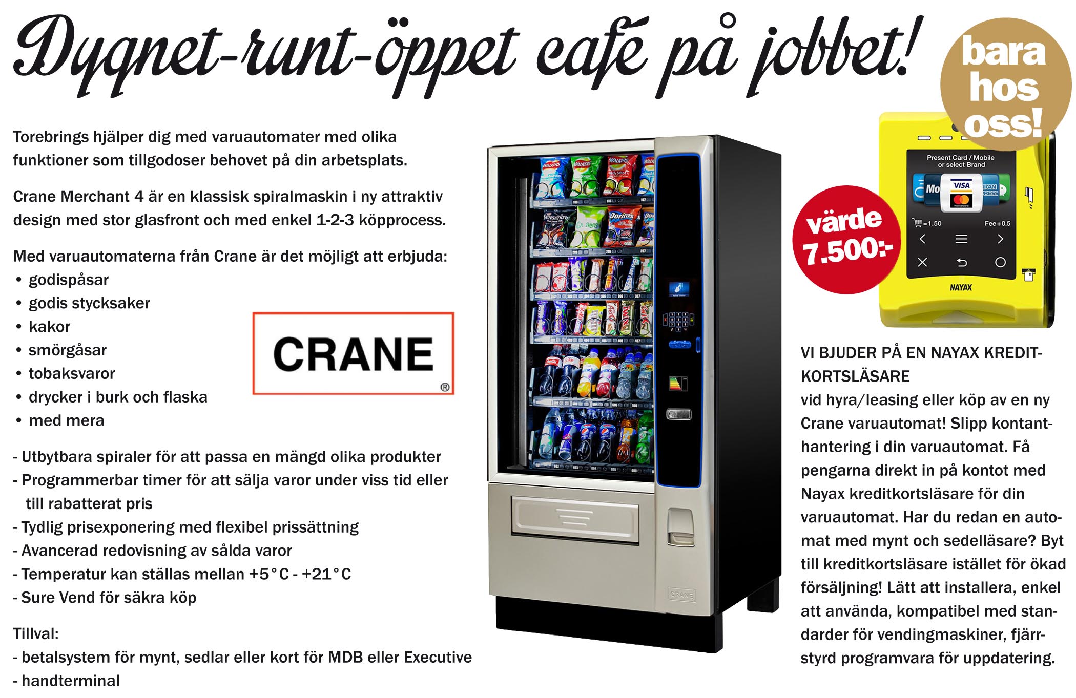 Hyr, leasa eller köp Crane Merchant Varuautomat. Vi bjuder på kreditkortsläsare Nayax, på-köpet-kampanj!