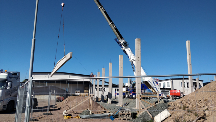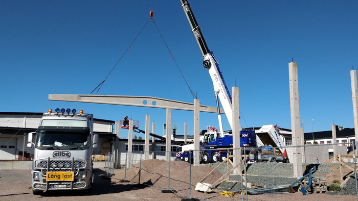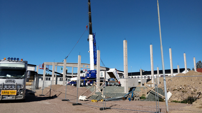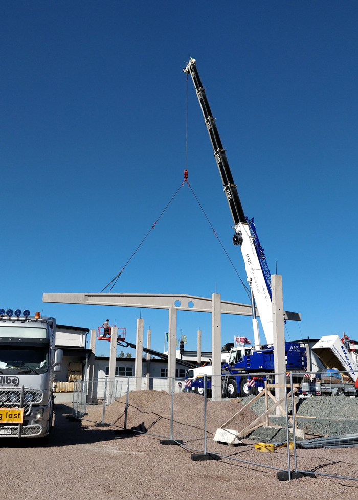 Idag lyftes den första takstolen med en vikt på 11 ton på plats.