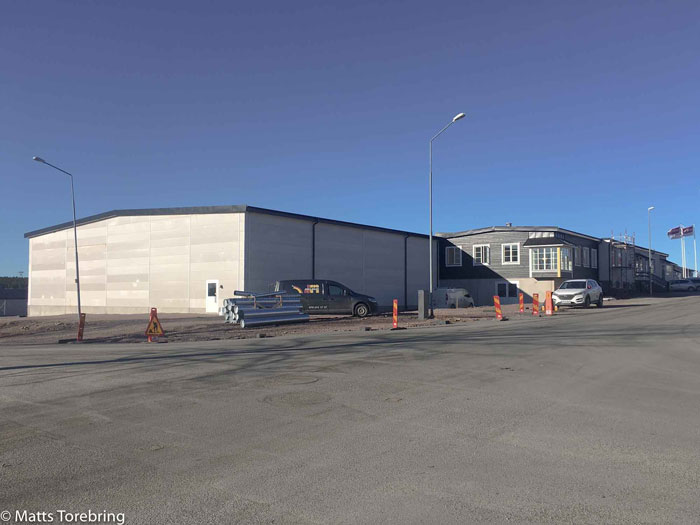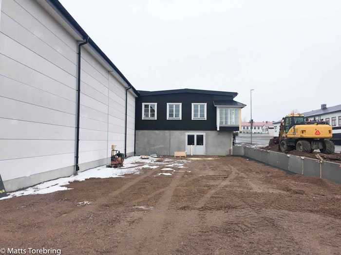 Fotot visar östra sidan på Torebrings tillbyggnad med nya höglagret och nytt kontor.