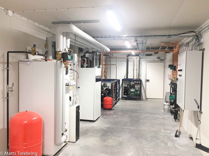 Vårt nya teknikrum som servar oss med bergvärme till hela nybyggnaden och kompressorer för kyl- och frysanläggning med nya godkända kylmedier.
