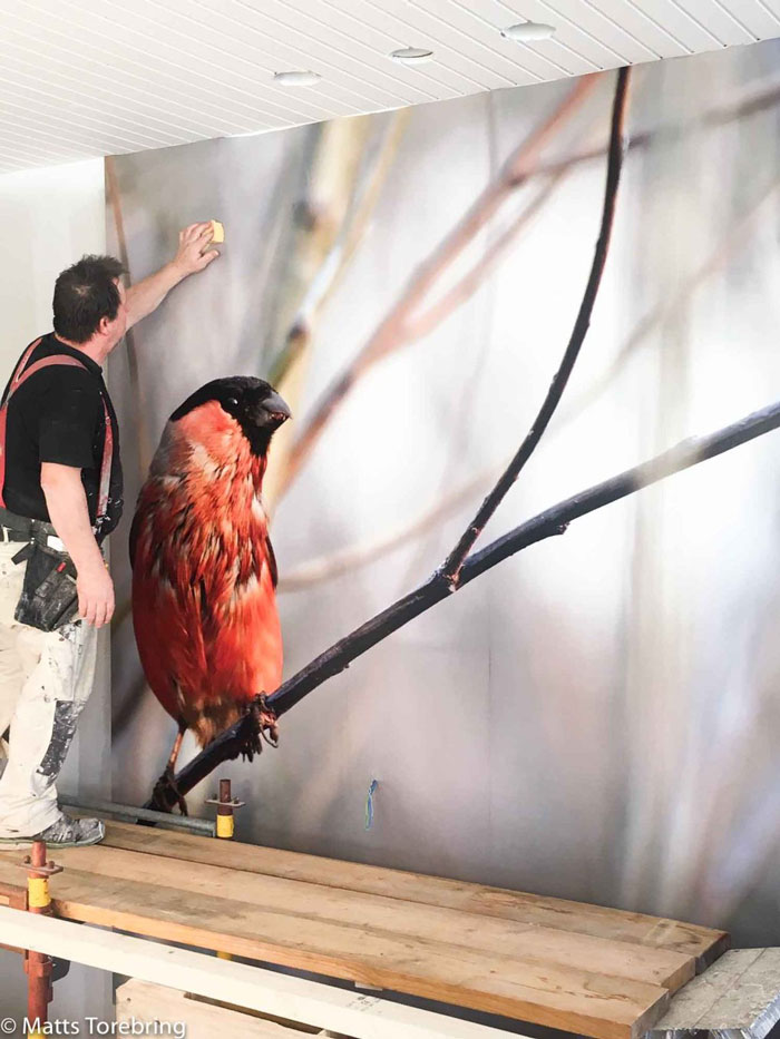 En vacker tapet med "byggherren" att vila ögonen i nya kontoret som skapar harmoni sätts upp här av målarmästaren Lasse.
