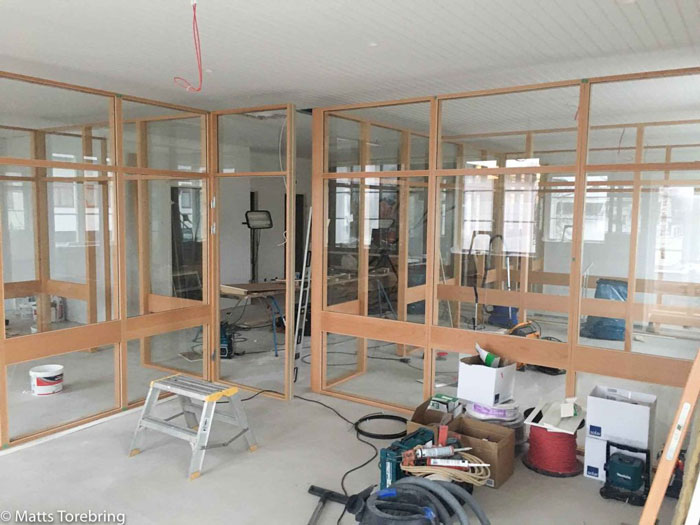 Det ser inte så stort ut bygget men det innefattar 1 000 m2 nytt höglager, 150 m2 workshop och 150 m2 med sex nya kontor och konferensrum. Trots allt återstår en massa bitar ännu, som skall komma på plats. Nästa vecka monteras innerväggar av glas mellan kontorsrummen, samt el och data kopplas in. Ventilation och frysrum ska trimmas in. Den gamla kyl- & frysen skall demonteras.