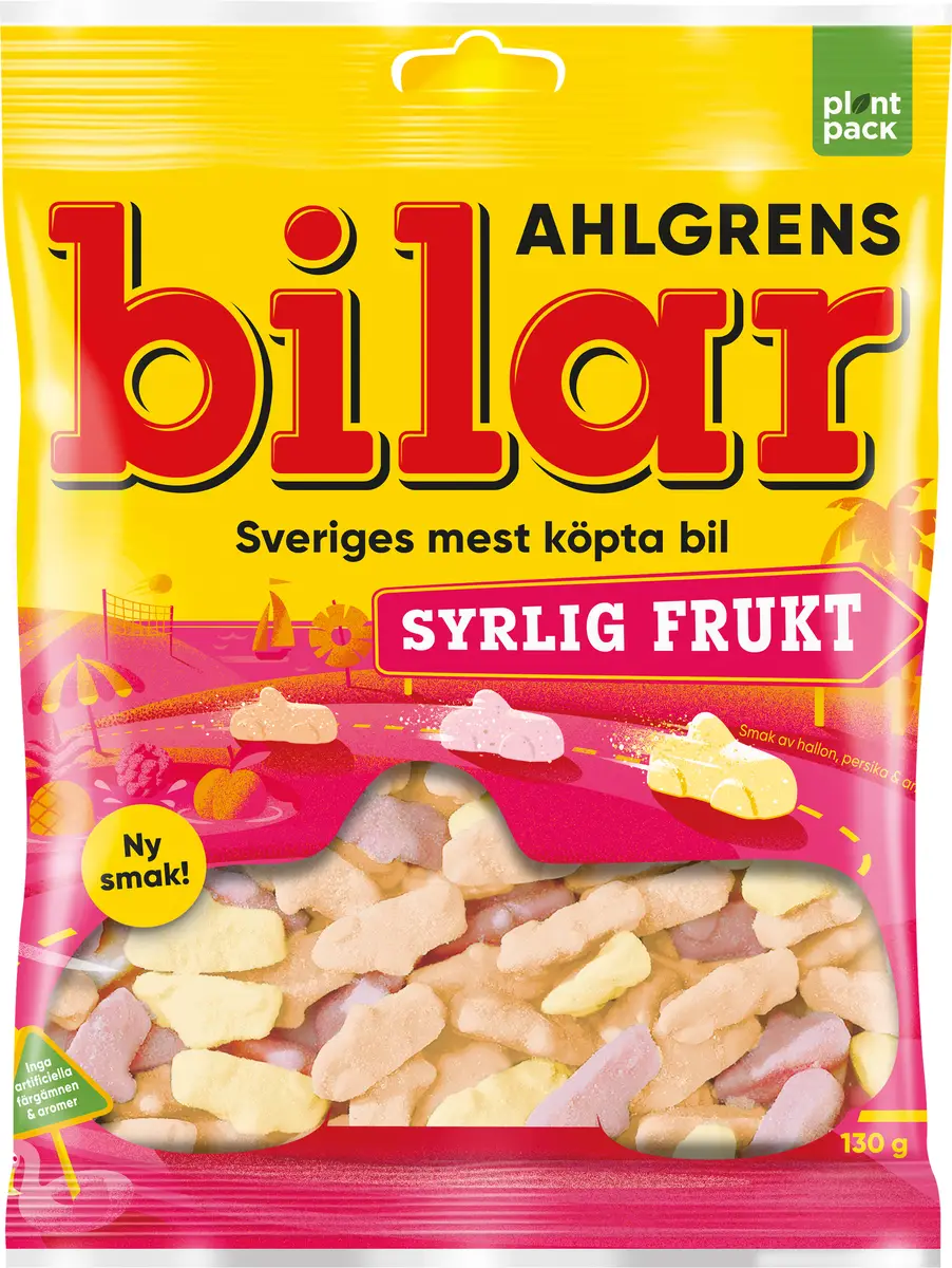 Ahlgrens Bilar Syrlig Frukt passar perfekt för dig som älskar syrligt skumgodis med fruktsmak. Påsen bjuder på fruktsmaker av hallon, persika och ananas i samma populära form och konsistens som originalbilarna, Bilarna är lackerade med en härligt syrlig sockeryta . Godispåsen innehåller 130 g skumbilar och är utan artificiella färgämnen och aromer. Ahlgrens Bilar - Sveriges mest köpta bil.