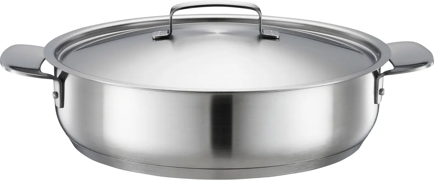 Den tjocka 3-lagersbotten ger effektiv och jämn uppvärmning på alla hällar. Den har också ett ugnssäkert handtag, lock med ångventilering samt en måttgradering på insidan.