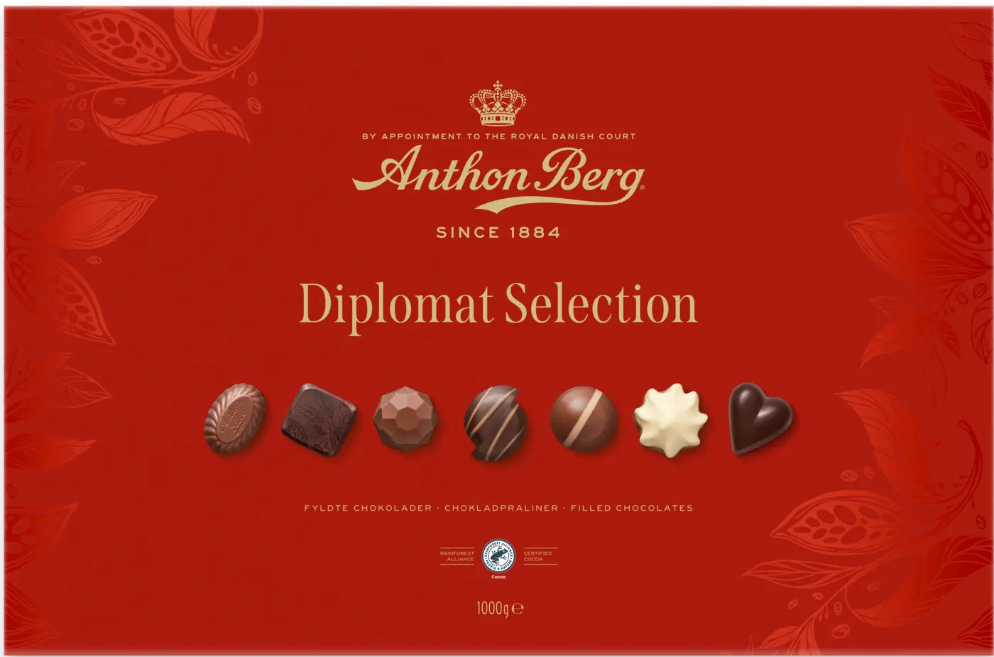 Anthon Berg Diplomat Selection är en lyxigt stor chokladask med speciellt utvalda och klassiska och fyllda praliner. I år är chokladaskarna uppdaterade med många nyheter och ny mix av praliner, större variation, flera med nougat och färre med marsipan. Chokladasken är nästan 60 cm lång och 40 cm bred, en helt otrolig chokladask med andra ord!