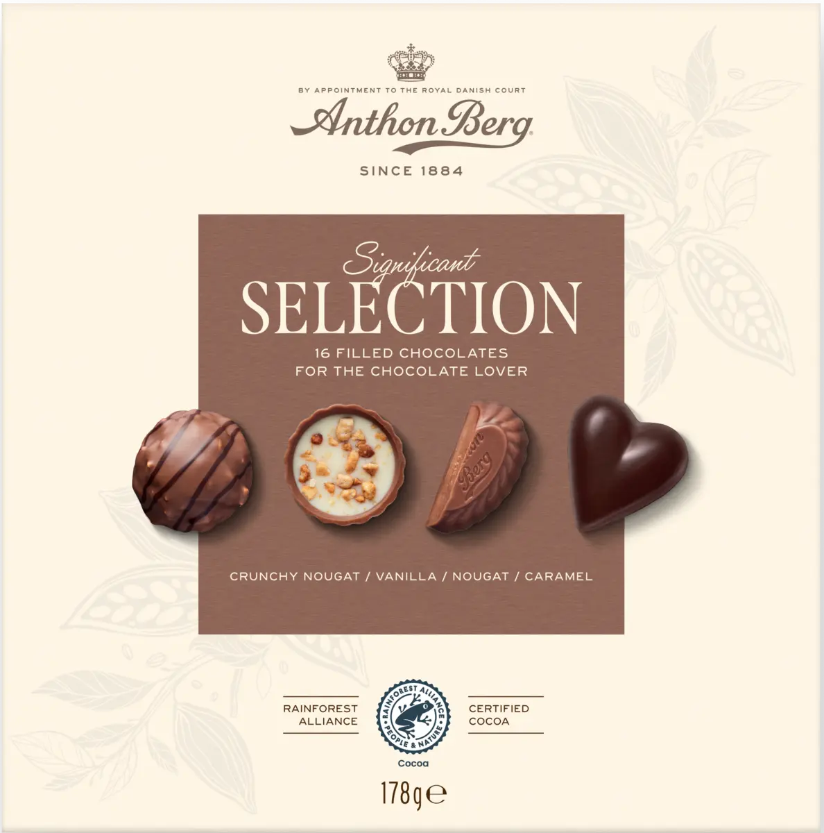 Anthon Berg Significant Selection är en chokladask för dig som söker efter variation och härliga smakkombinationer, asken innehåller ett urval av våra utsökta praliner med nougat, marsipan, vaniljtryffel och krämig karamell.
