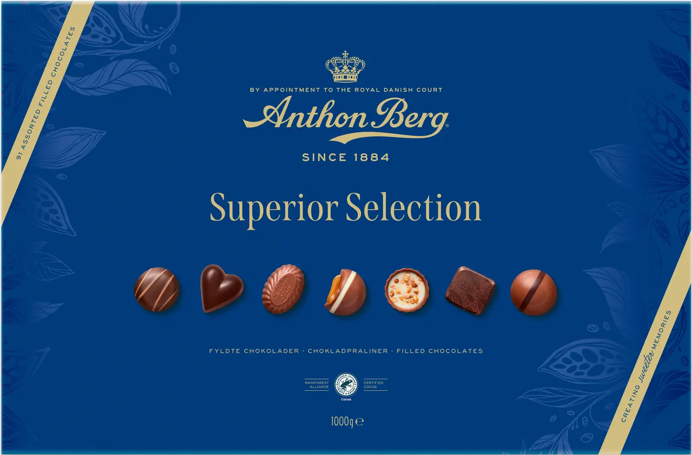 Anthon Berg Superior Selection 1000g är en lyxigt stor chokladask med speciellt utvalda och klassiska och fyllda praliner. I år är chokladaskarna uppdaterade med många nyheter och ny mix av praliner, större variation, flera med nougat och färre med marsipan. Chokladasken är nästan 60 cm lång och 40 cm bred, en helt otrolig chokladask med andra ord!