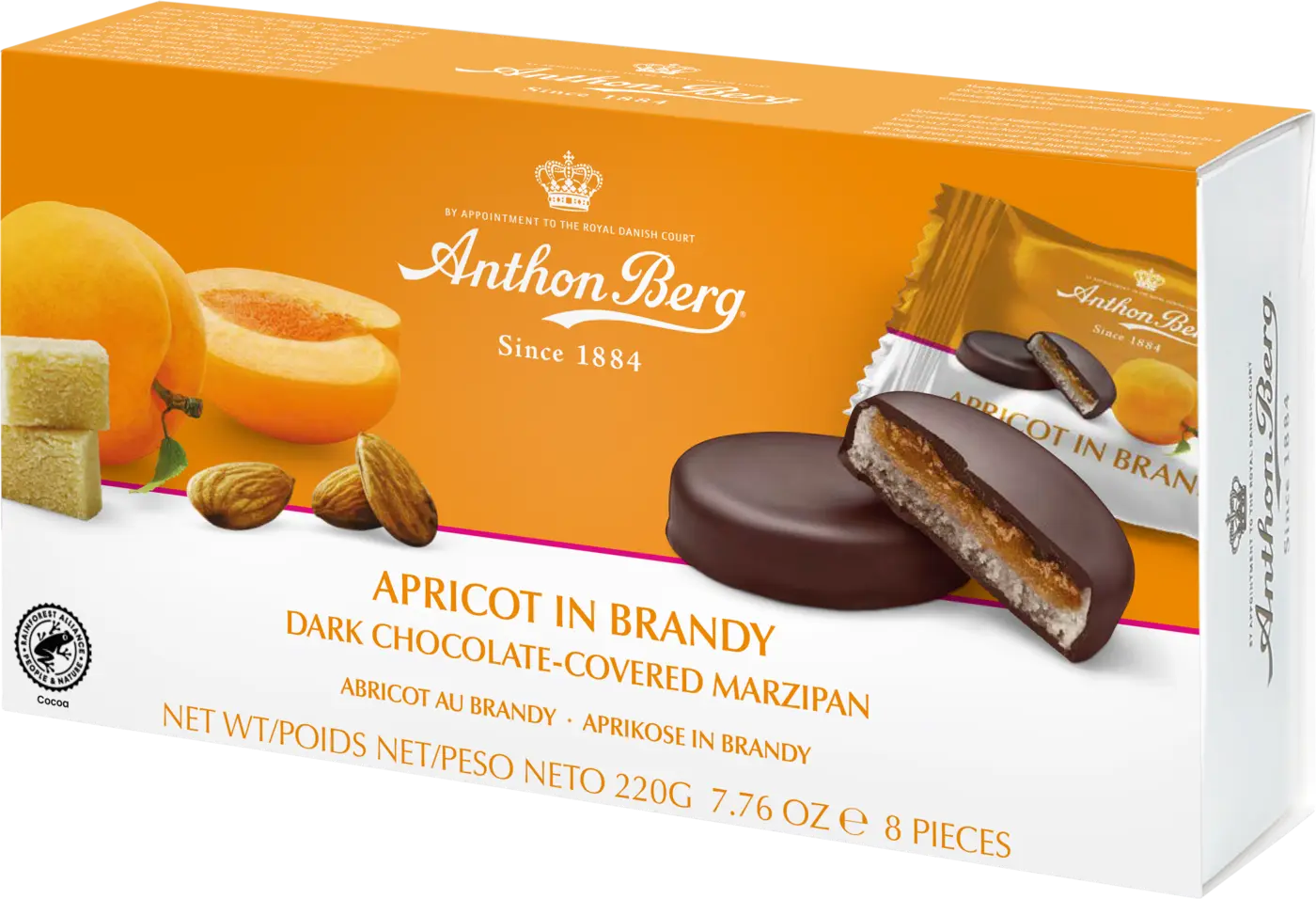 Anthon Bergs små goda "Marsipantårtor", mörk choklad fylld med ljuvlig marsipan och aprikos i cognac. Varje "tårta" är separat förpackad i asken. Även god till en kopp kaffe. Utan palmolja.
