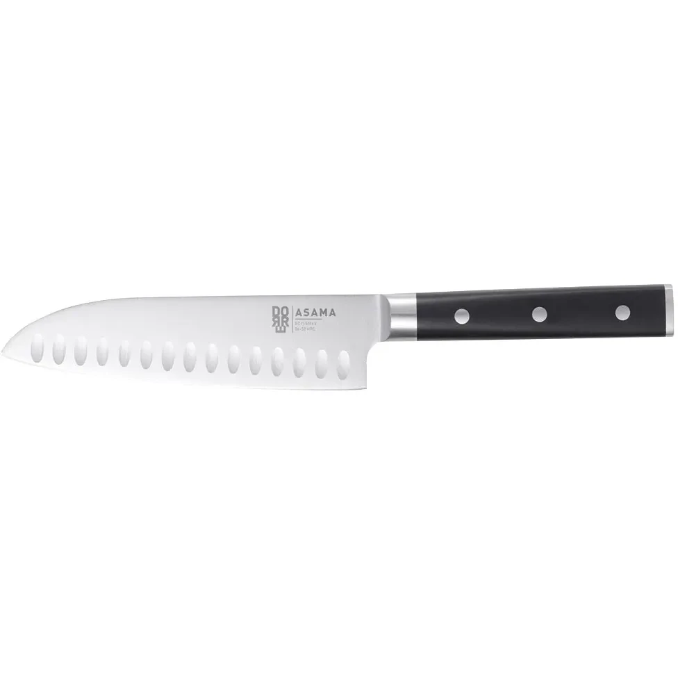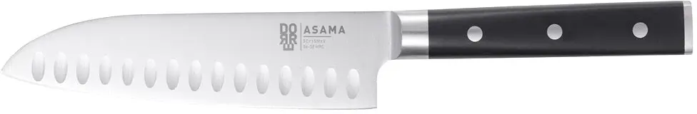 Asama Santoku är en mångsidig kniv designad för precision i köket. Det breda bladet i högkvalitativt 5Cr15MoV-stål (HRC 56-58) ger en enastående balans mellan skärpa och hållbarhet, vilket gör den idealisk för att hacka, skiva och tärna grönsaker, fisk och kött. Bladets karaktäristiska kullriga yta minskar friktionen och förhindrar att råvaror fastnar, vilket gör arbetet snabbare och smidigare. Det ergonomiska handtaget ger ett bekvämt grepp för full kontroll vid varje skärning.