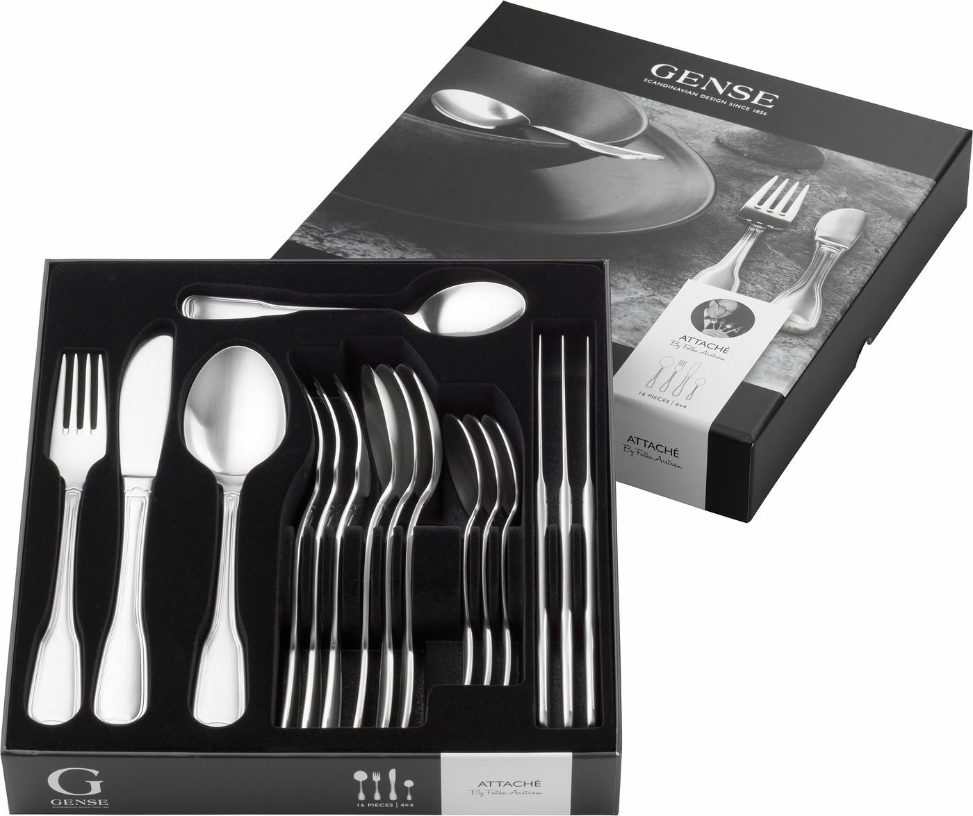 Attaché står för en klassisk och ren design inspirerad av barocken. Besticken har en traditionell stil designad med en dubbelräfflad kant. Den är mycket användbar till vardag som till festliga tillfällen. Attaché är tillverkat i rostfritt matt stål 18/8.