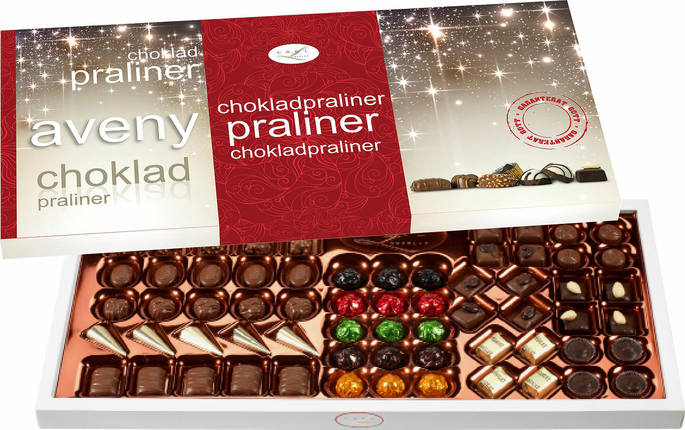 Letar du efter den perfekta julchokladen för att förgylla julen? Då är Aveny Carl Choklad det självklara valet! I glänsande koppartråg ligger 64 spännande praliner och väntar ! Chokladpraliner av mörk & mjölkchoklad, smaksatta med