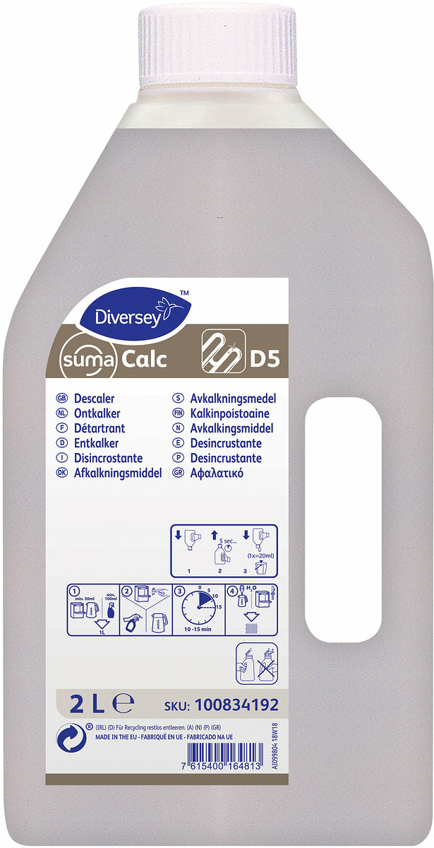 Suma Calc D5 är ett koncentrerat surt rengörings- och avkalkningsmedel för att avlägsna svåra föroreningar och kalkbeläggningar på diskmaskiner, kaffebryggare, kokgrytor och annan utrustning i storkök.