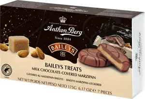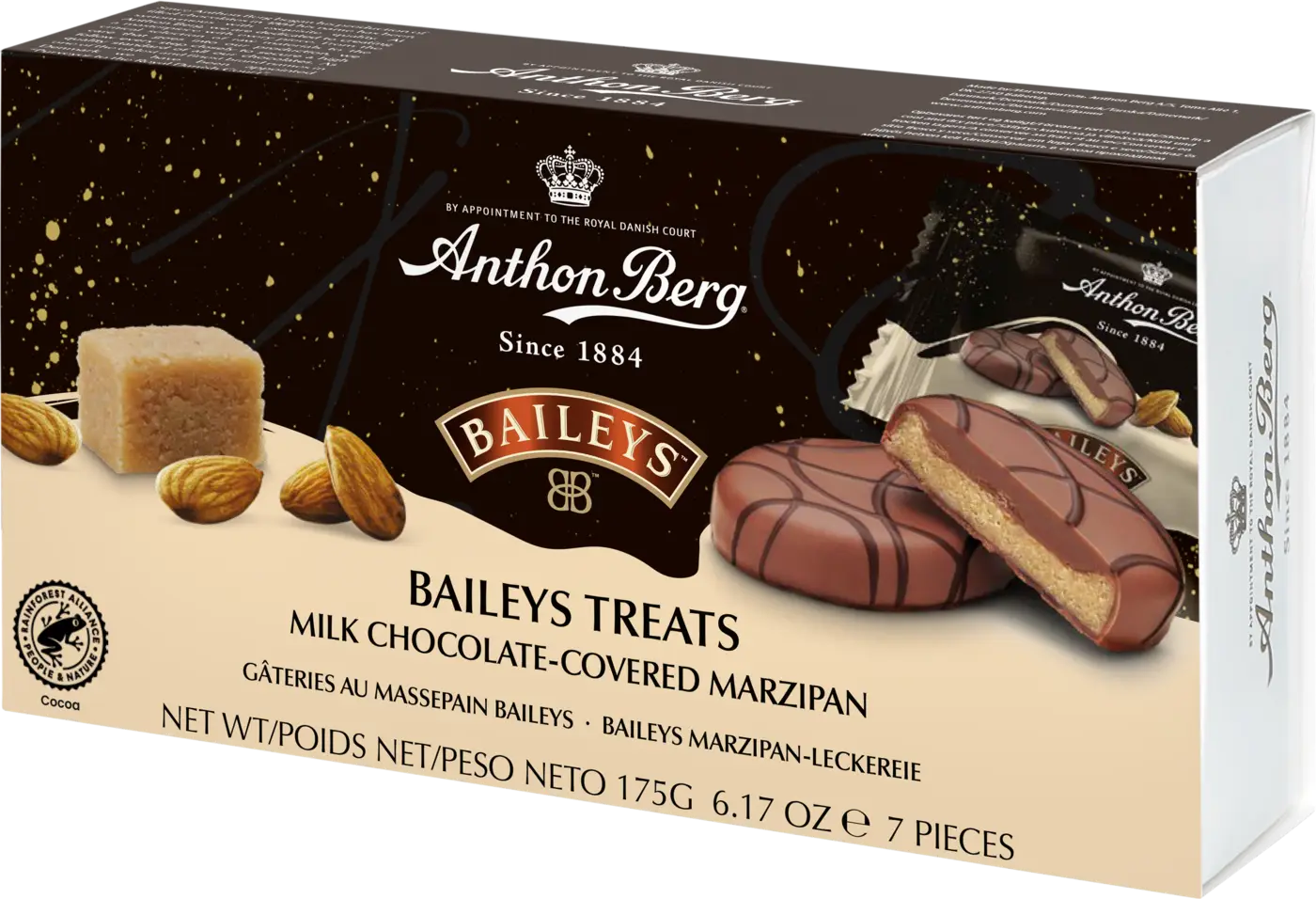 Anthon Bergs små goda "Marsipantårtor", mjölkchoklad fylld med ljuvlig marsipan med smak av Baileys cremelikör. Varje "tårta" är separat förpackad i asken. Även god till en kopp kaffe. Utan palmolja.
