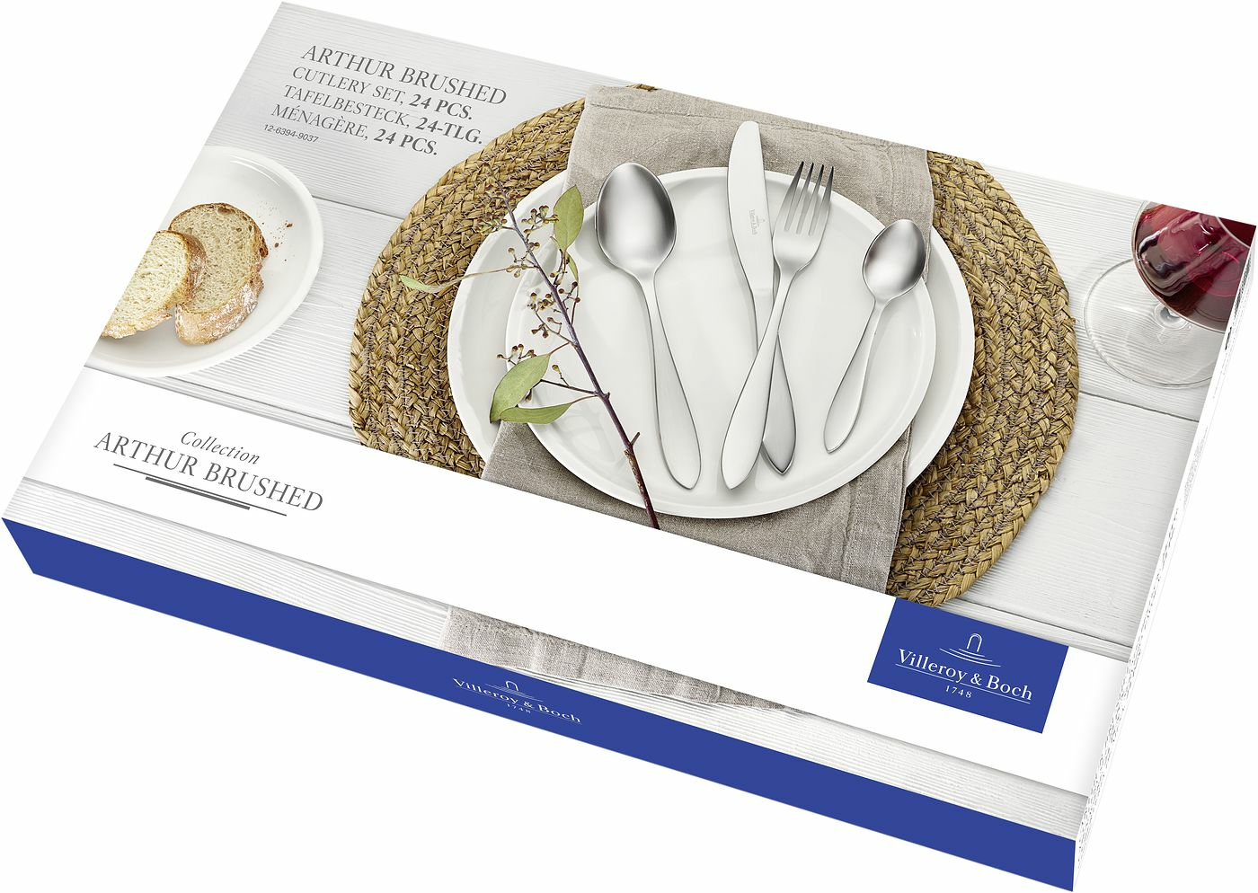 Flödande linjer och en tidlös design gör Arthur till utmärkt allbestick och en perfekt match för våra eleganta porslinssamlingar. Satsen finns i en polerad eller matt borstad version. Detta bestickset för upp till sex personer är alltid det rätta valet och ger en tidlös vacker och elegant touch till ditt bord, vare sig det är en festlig middag eller en mysig familjemåltid. Imponera dina gäster med elegant och praktiskt bestick, oavsett tillfälle.
