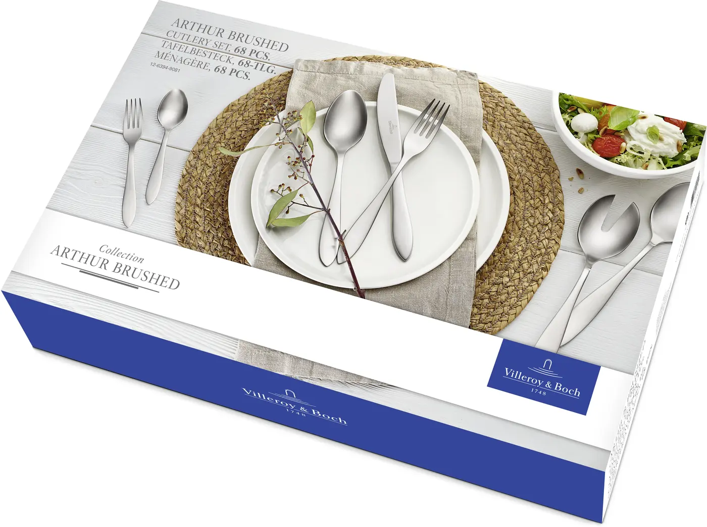 Flödande linjer och en tidlös design gör Arthur till utmärkt allbestick och en perfekt match för våra eleganta porslinssamlingar. Satsen finns i en polerad eller matt borstad version. Detta kompletta bestickset med 68 delar är alltid det rätta valet och ger en tidlös vacker och elegant touch till ditt bord, vare sig det är en festlig middag eller en mysig familjemåltid. Imponera dina gäster med elegant och praktiskt bestick, oavsett tillfälle.