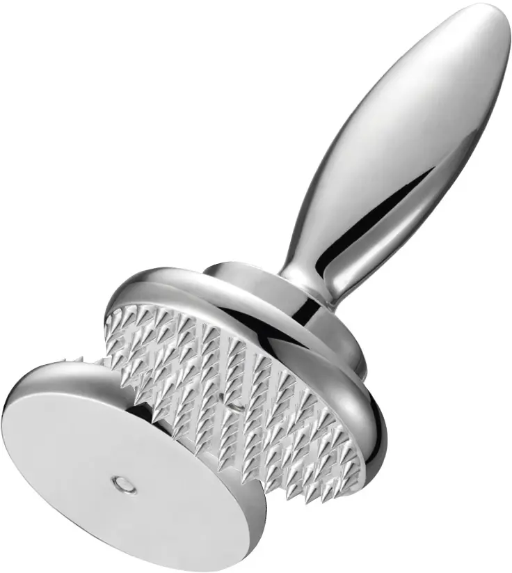 Praktisk köttbankare med två funktioner: ena sidan med piggar för att möra kött och den andra helt platt för att jämna ut köttbitar. Tillverkad i slitstarkt rostfritt stål med bekvämt grepp. Ett oumbärligt redskap för perfekt tillagning.