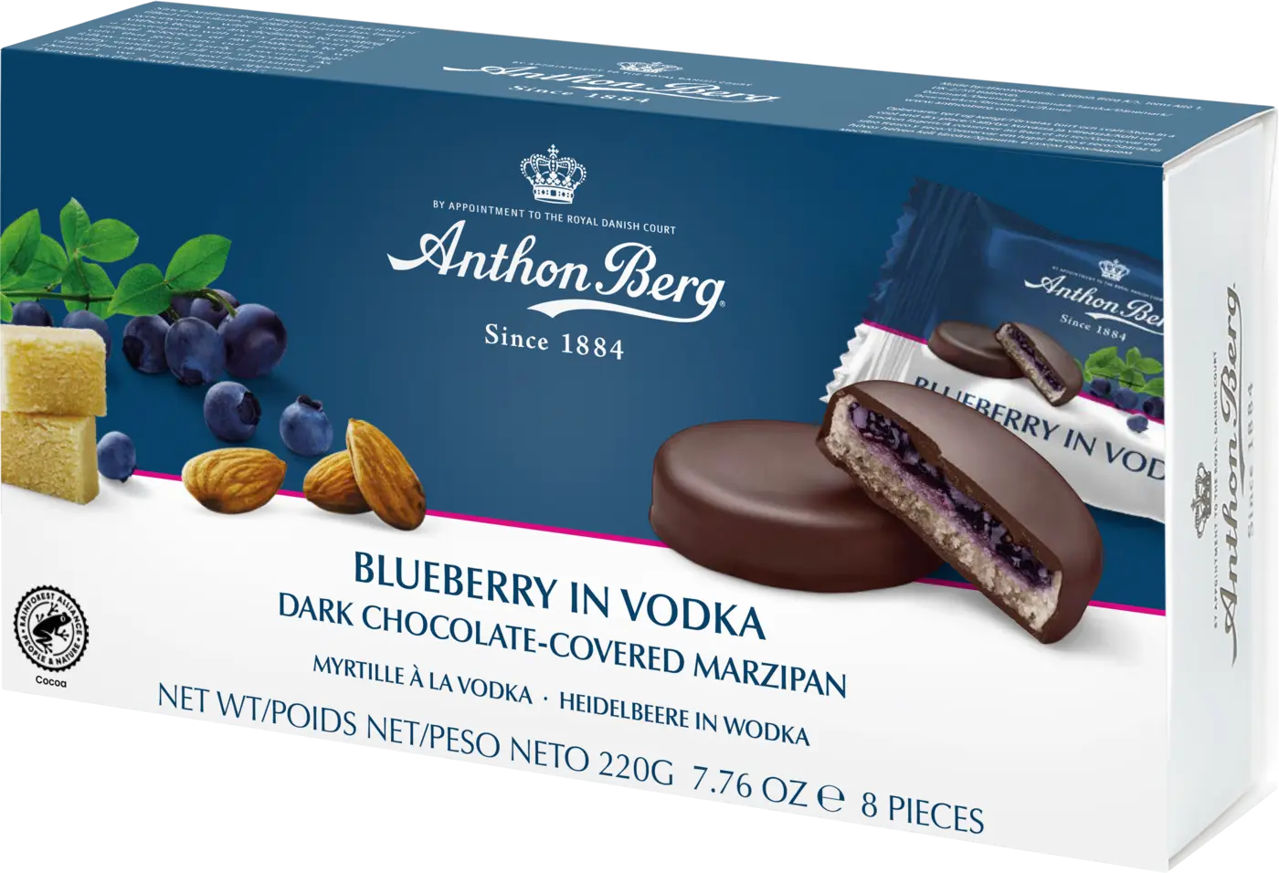 Anthon Bergs små goda "Marsipantårtor", mörk choklad fylld med ljuvlig marsipan och blåbär i vodka. Varje "tårta" är separat förpackad i asken. Även god till en kopp kaffe. Utan palmolja.