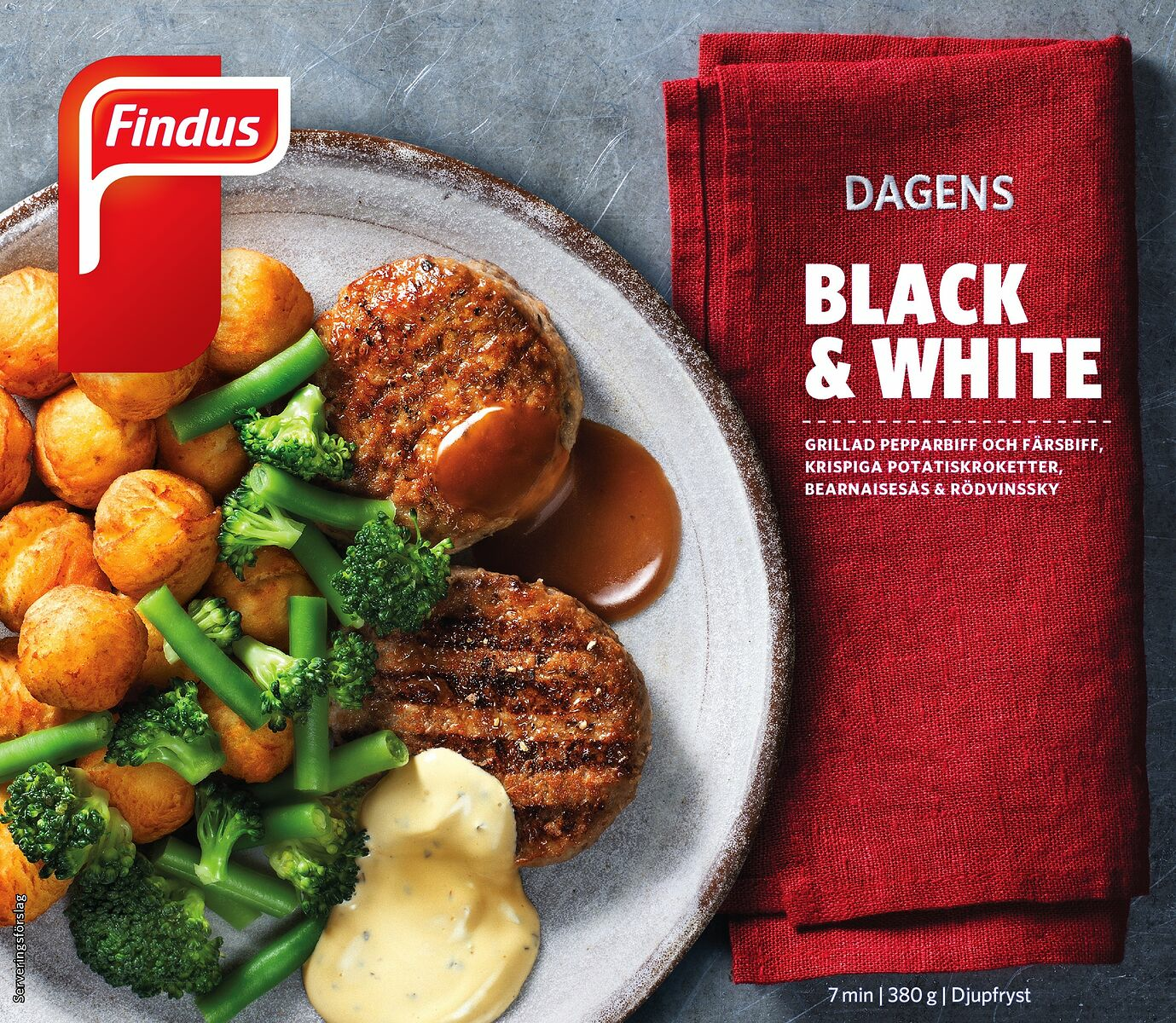 Potatiskroketter 35 %: Potatis, rapsolja, salt, druvsocker, kryddor, potatisstärkelse, stabiliseringsmedel (E464). Rödvinssky 14 %: Vatten, rödvin 1,5 %, lök, morötter, majsstärkelse, tomatpuré, sojasås (vatten, SOJABÖNOR, VETE, salt), rapsolja, nötköttsbuljong, karamelliserat socker, salt, socker, grönsakskoncentrat (tomat, morot, lök), vitpeppar, lagerblad. Bearnaisesås 13 %: SKUMMJÖLK, smör (MJÖLK) 2,3 %, rapsolja, ÄGGULA 1 %, majsstärkelse, citronjuice, salt, persilja, förtjockningsmedel (fruktkärnmjöl, guarkärnmjöl), dragon, vitpeppar, gurkmeja. Pepparbiff 10,5 %: Nötkött, griskött, potatis, ÄGG, lök, SKUMMJÖLKSPULVER, potatisstärkelse, ÄGGVITA, potatisfiber, salt, kryddor (bl a lökpulver, libbsticka), SENAPSPULVER, nötköttsbuljong, socker, rapsolja. Nötfärsbiff 10,5 %: Nötkött, potatis, lök, potatisstärkelse, SKUMMJÖLKSPULVER, ÄGG, salt, vit- och svartpeppar, rapsolja. Gröna bönor 9 %, broccoli 8 %. I rätten ingår 21 % Färs- och pepparbiff motsvarande 14 % nöt- och griskött. En portion ger dig 65 gram grönsaker.