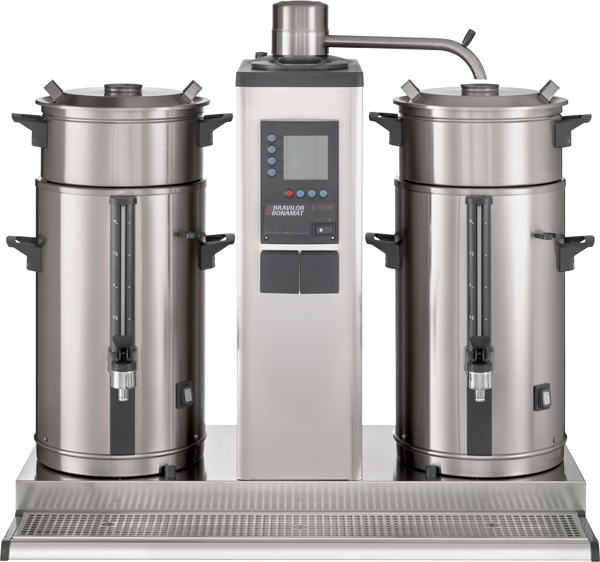 Rund bryggmaskin för utrymmen med vattenanslutning. Brygger stora mängder kaffe i separata behållare. Utrustad med digital display, total- och dagräknare, avkalkningssystem, signal när kaffet är klart, inbyggd timer och hög säkerhet. Levereras med behållare av VHG-typ, bryggenhet(er) och spillbricka.