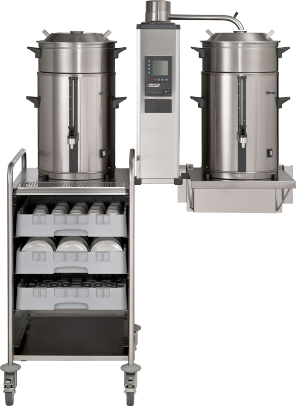 Bryggare för korgfilter som ska monteras på väggen i utrymmen med vattenanslutning. Brygger stora mängder kaffe i separata behållare. Utrustad med digital display, total- och dagräknare, avkalkningssystem, signal när kaffet är klart, inbyggd timer och hög säkerhet. Levereras med behållare av VHG-typ, bryggenhet(er) och väggkonsol. Vagn ingår inte.