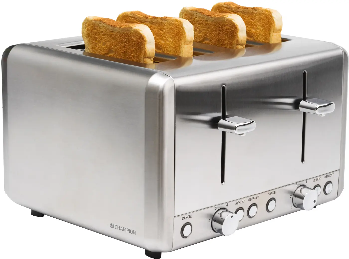 Champions brödrost ger gyllene rostat bröd för familjens lugna morgonstunder. Med 6 ställbara värmenivåer väljer du enkelt den nivå av rostning du önskar. Med en stilren designen i rostfritt stål blir brödrosten en fin detalj i köket. Brödrosten rymmer 4 brödskivor per rostning och har funktioner för upptining samt återuppvärmning.