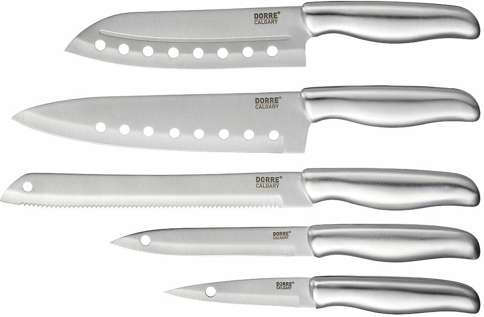 5 vassa kvalitetsknivar från Dorre som hjälper dig att lyckas i köket. Calgary Knivset består av en japansk kniv, en kockkniv, en brödkniv, en allkniv och en skalkniv.