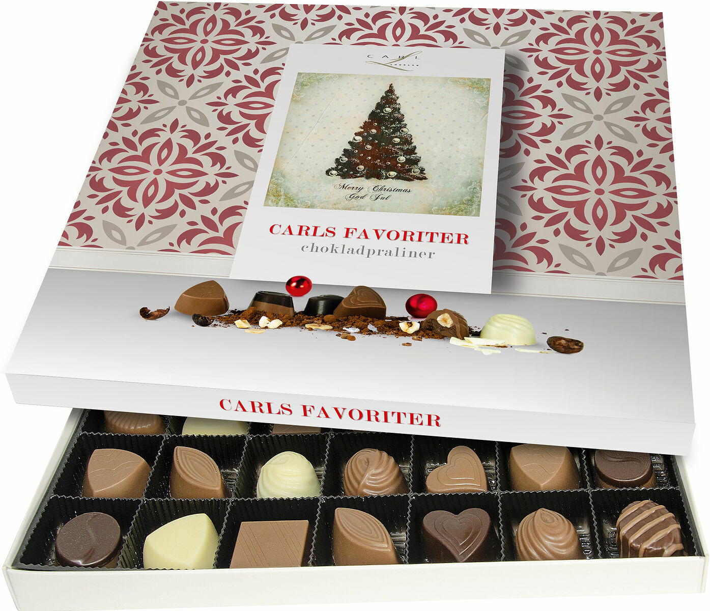 Upptäck Carls favoriter chokladpraliner, en delikat samling av lyxiga praliner som gör varje ögonblick speciellt. Denna eleganta chokladask är den perfekta julchokladen att ge bort som en meningsfull julgåva. Med en blandning av fina smaker och en lyxig presentation blir detta den ultimata julklappen för både personal och företag. Visa dina anställda din uppskattning med denna smakfulla personalgåva. Beställ Carls favoriter chokladpraliner idag och sprid glädje och njutning denna jul!
