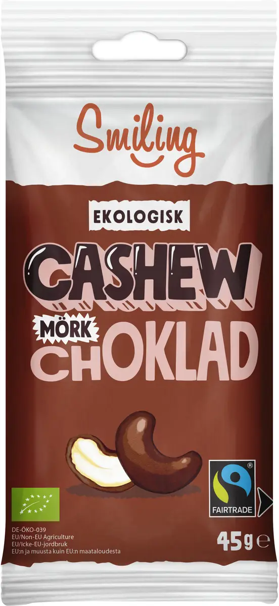Smilings cashewnötter med mörk choklad är för dig som gillar lite extra goda stunder i vardagen! Nötterna odlas på Afrikas västkust av Adja, Jacob, Yaoua och de andra bönderna. Nötterna är ekologiska och Fairtrade-märkta vilket möjliggör hållbar utveckling i råvarulandet Elfenbenskusten. När du väljer Smilings goda cashewnötter är du med och skapar hållbar utveckling i odlingsländerna. Du gör gott samtidigt som du äter gott!