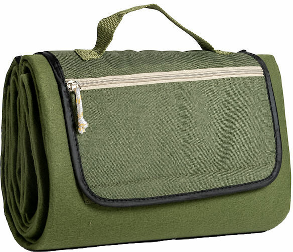 Lyxig och sportig picknickpläd med vattenavvisande undersida och fack med dragkedja för förvaring. Finns i grönt rPET-material. Pläden rullas enkelt och smidigt ihop och kan sedan bäras i handtaget.