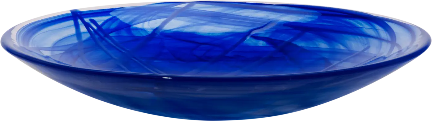 Contrast från Kosta Boda tillverkas med en teknik som heter centrifugering, vilket skapar slöjor av färg inuti glasmassan. I kombination med färgade glaspinnar som adderas i processen, blir varje produkt unik. Det blå/blå fatet i serien är perfekt för olika uppläggningar eller som fruktfat.