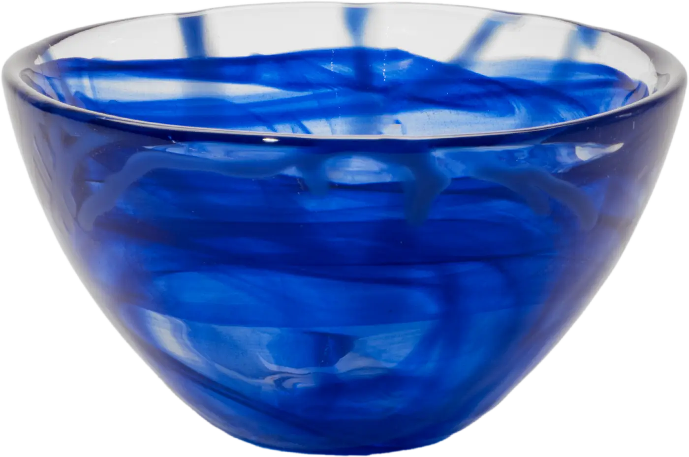 Serien Contrast från Kosta Boda tillverkas med en teknik som kallas centrifugering. Tekniken uppfanns i småländska glasriket på 1950-talet och skapar slöjor av färg inuti glasmassan. I kombination med färgpulver och glaspinnar som adderas under processen blir varje produkt unik. Den lilla blå/blå skålen är vacker på egen hand – eller varför inte som fruktskål?