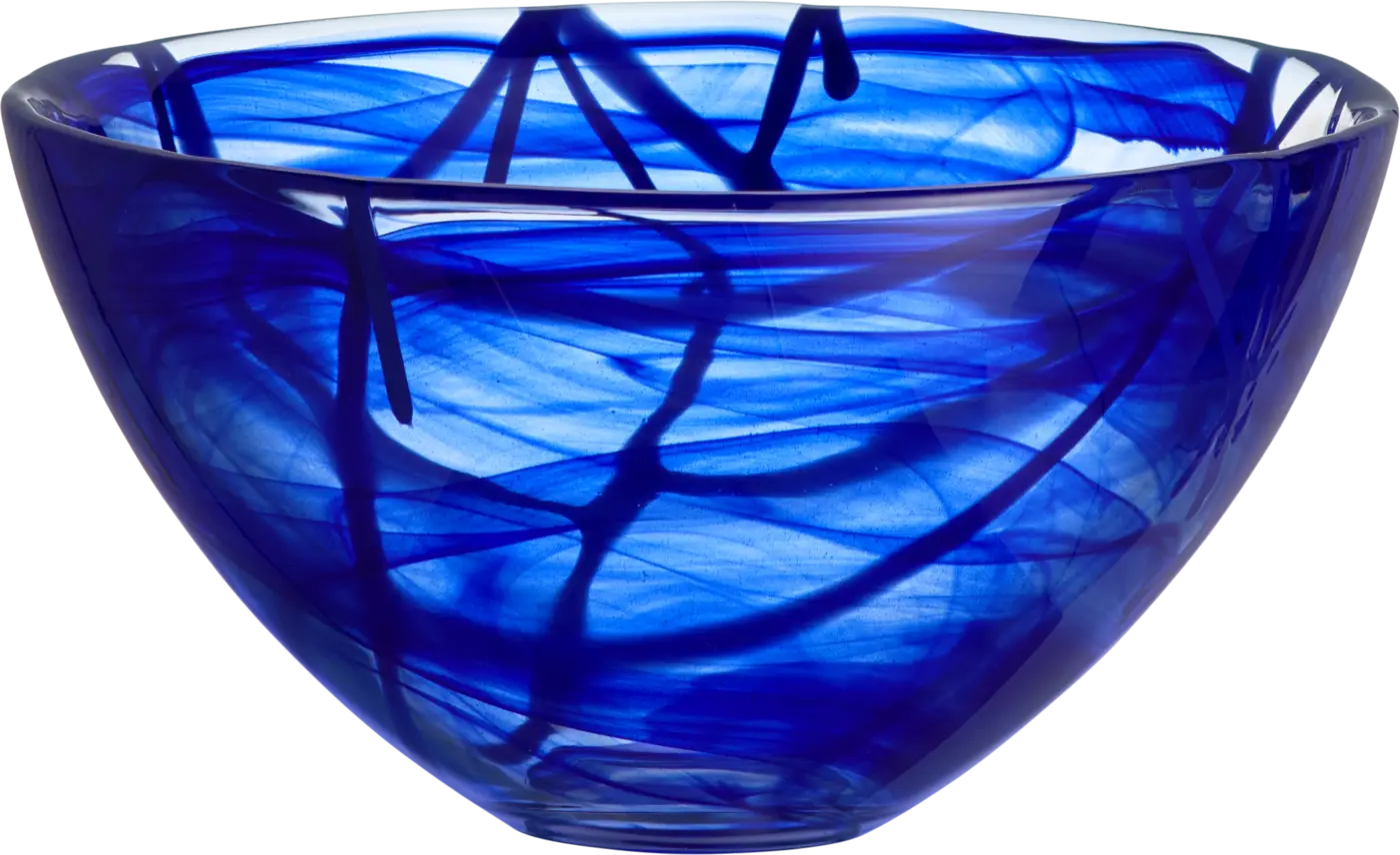 Serien Contrast från Kosta Boda tillverkas med en teknik som kallas centrifugering. Tekniken uppfanns i småländska glasriket på 1950-talet och skapar slöjor av färg inuti glasmassan. I kombination med färgpulver och glaspinnar som adderas under processen blir varje produkt unik. Den blå/blå skålen är vacker på egen hand – eller varför inte som fruktskål?