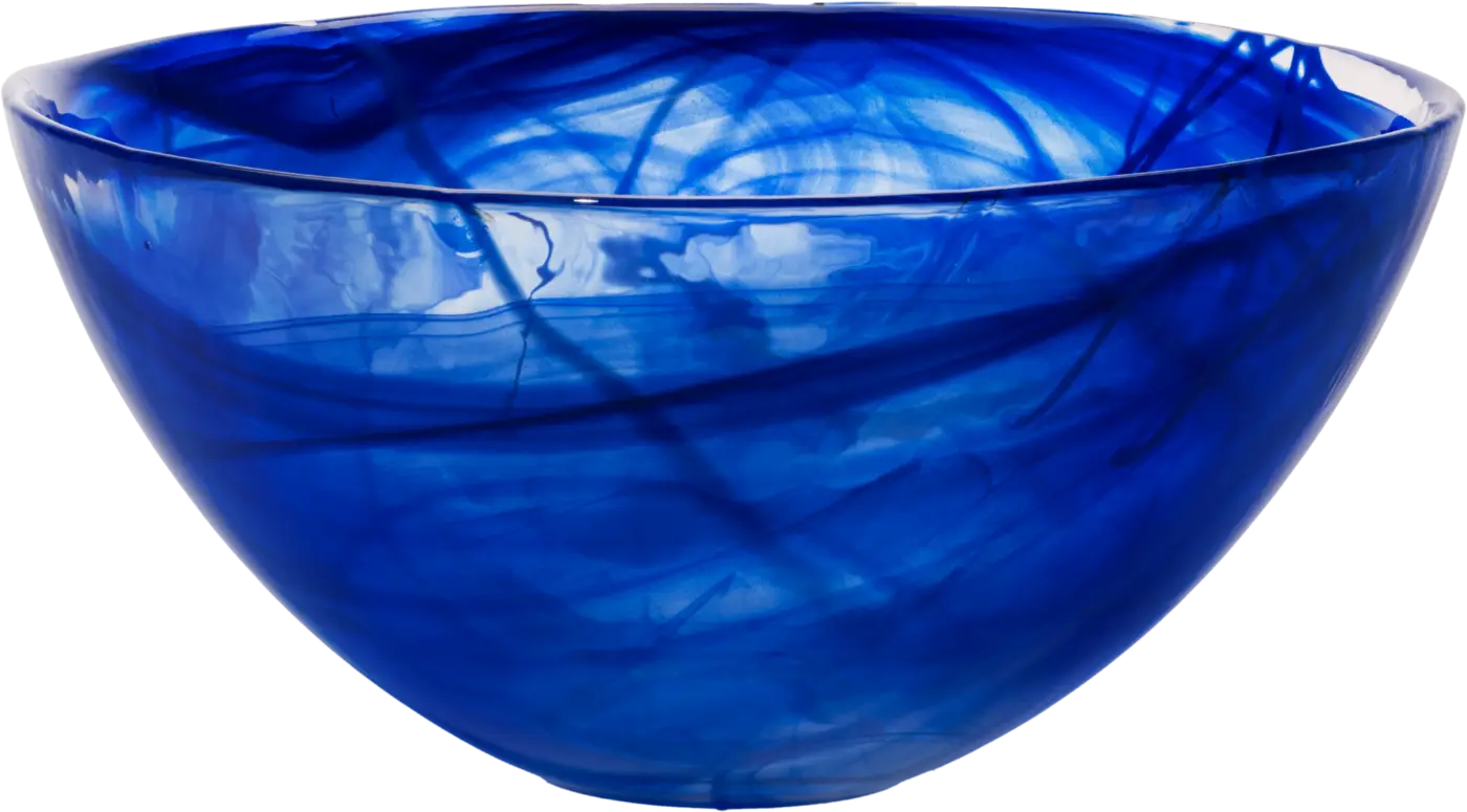 Serien Contrast från Kosta Boda tillverkas med en teknik som kallas centrifugering. Tekniken uppfanns i småländska glasriket på 1950-talet och skapar slöjor av färg inuti glasmassan. I kombination med färgpulver och glaspinnar som adderas under processen blir varje produkt unik. Den stora blå/blå skålen är vacker på egen hand – eller varför inte som fruktskål?
