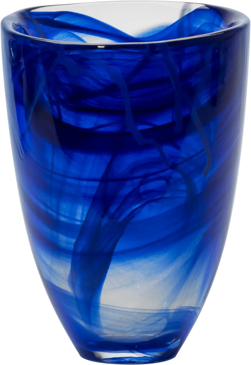 Serien Contrast från Kosta Boda tillverkas med en teknik som kallas centrifugering. Tekniken uppfanns i småländska glasriket på 1950-talet och skapar slöjor av färg inuti glasmassan. I kombination med färgpulver och glaspinnar som adderas under processen blir varje produkt unik. Den blå/blå vasen är vacker på egen hand – men fyll den ännu hellre med blommor!