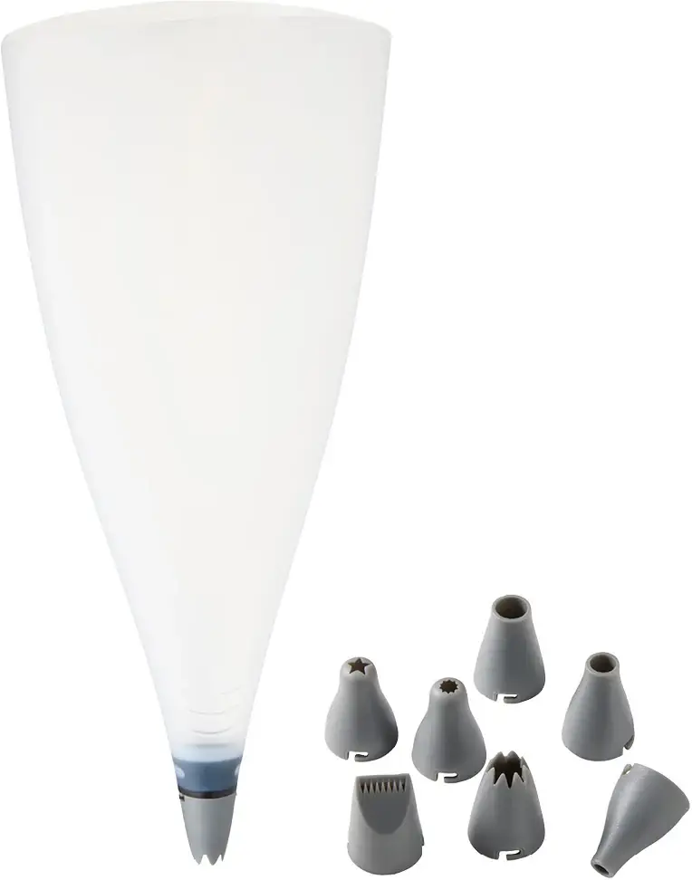 Utforska kreativiteten med vårt spritsset! 8 silikonverktyg för perfekt dekoration. Diskmaskinssäkert och redo att lyfta ditt bakande till nya höjder.