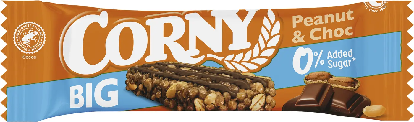 Corny BIG 0% Peanut & Choc är en smarrig muslibar med jordnötter och chokladsmak, utan tillsatt socker. Laddad med knapriga jordnötter och fullkornsflingor och toppad med choklad.