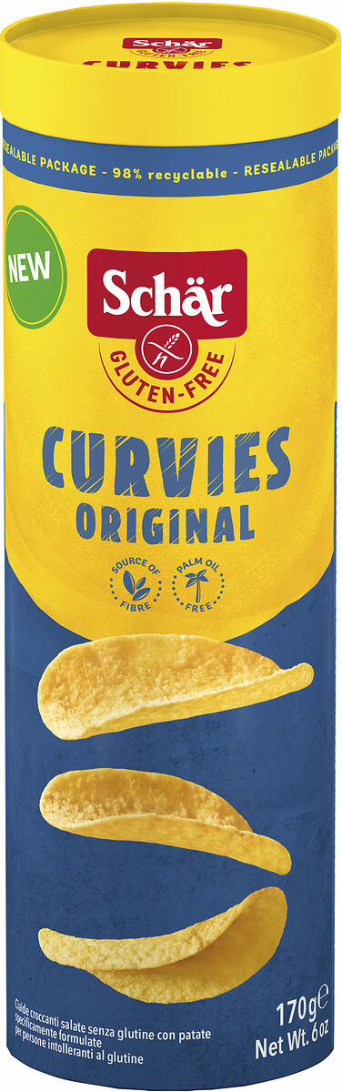 Schär Curvies Original är glutenfria lättsaltade chips i en praktisk förpackning. Dessa glutenfria chips är det perfekta snackset för varje tillfälle. Innehåller fibrer. Fri från gluten. Utan tillsats av ägg, palmolja och konserveringsmedel.