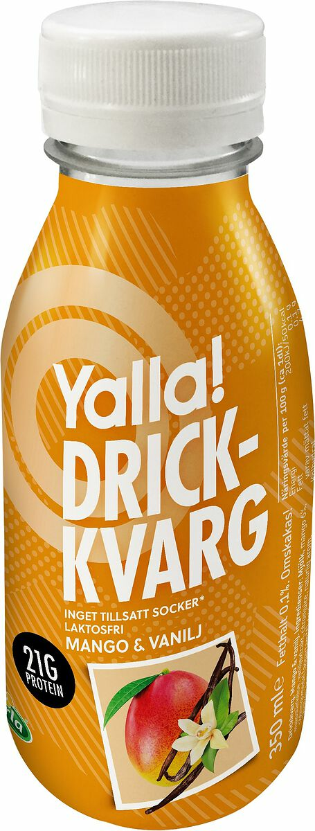 Yalla Drickkvarg Mango Vanilj har inget tillsatt socker, är laktosfri, har mycket protein och är mättande. Inga färgämnen, inga konserveringsmedel. Flaskan har skruvlock - drick i farten, ta med till träningen eller ät som mellanmål.