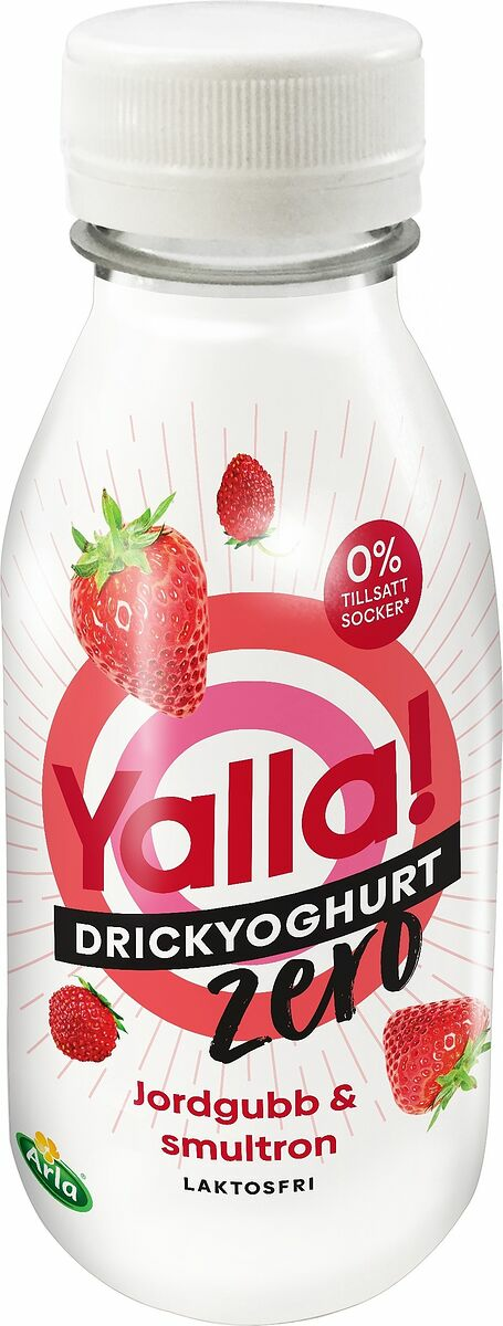 Yalla Zero jordgubb & smultron släcker törsten och mättar, och har inget tillsatt socker. Den är även laktosfri. Yalla drickyoghurt är rik på frukt och har inga färgämnen eller konserveringsmedel. Passar utmärkt vare sig du är hemma, på jobbet, i skolan eller på språng!