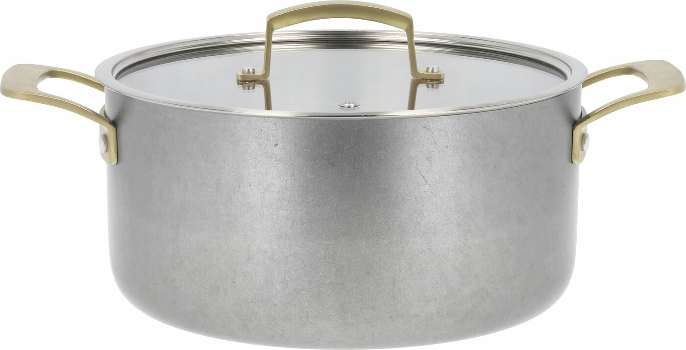 Tillverkad av rostfritt 18/10-stål med en kraftig 2,5 mm 3-skiktskonstruktion av rostfritt stål, aluminium och rostfritt stål. Det mellersta skiktet av aluminium ger optimal värmefördelning. Nitade gjutna stålhandtag som är PVD-förgyllda. Utsidan har vintage-polering. Glaslock med ånghål. Måttstreck på insidan av kastruller och grytor. Passar alla värmekällor, inkl. induktion. Tål maskindisk. Gryta med lock Durance 5 liter 24 cm Rostfritt stål