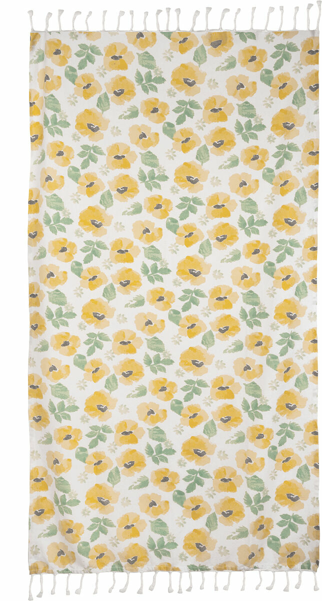 Eden hamam är en vackert mönstrad handduk med fransar i tunn, vävd återvunnen bomull (70%) och polyester (30%). Mönstret är noga framtaget med målade blommor i mjuka pasteller som går i gult och beige. Den torkar fort och är lätt att hänga upp. Smidig att rulla ihop och ha med sig till stranden, poolen eller i träningsväskan.