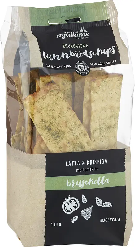 INGREDIENSER VETEmjöl*, RÅGmjöl*, sirap*, salt och jäst/gjær. Friterad i rapsolja*. Smaksatt med bruschettakrydda* (tomat*, lök*, havssalt, vitlök*, basilika*). * = ekologisk råvara
