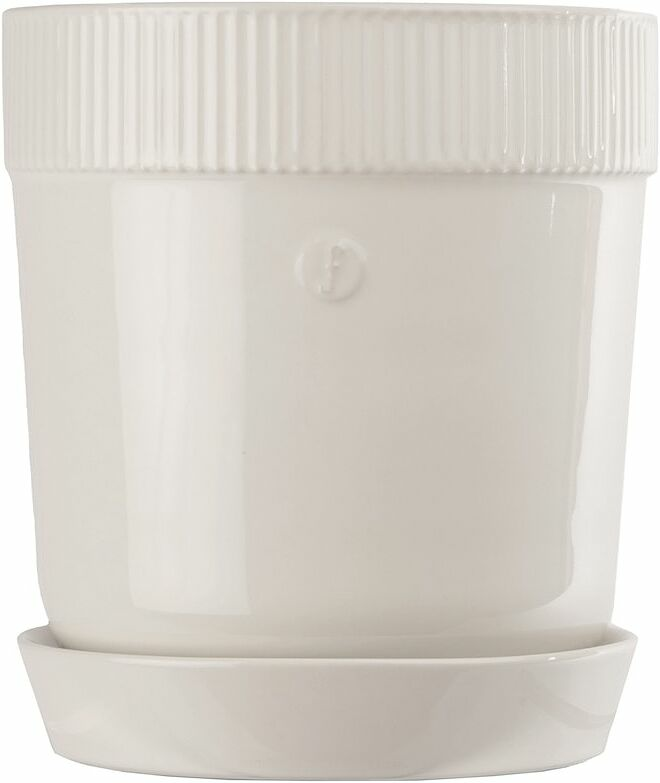 Elise kruka med fat har alla rätt. Den kombinerar designen av färg, form och detaljer med praktiska inslag som dräneringshål och ett fat som går högre upp. Elisa kruka har en mjukt rundad form med enkla raka snitt och är tillverkad i klassiskt stengods. Krukan är dekorerad med ett emblem och Sagaforms karakteristiska rand och har sedan glaserats i tre vackra och naturnära kulörer. En kruka som blir ett varmt inslag i alla hem. Elise finns i två storlekar.