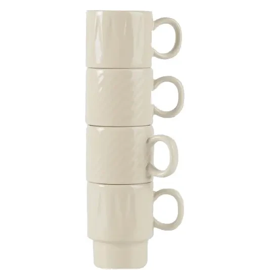 Ett 4-pack stapelbara espressokoppar i stengods med karakteristisk relief i en vacker naturinspirerad färg. Den mjuka beige tonen harmoniserar fint med seriens övriga färger, men är också vacker på egen hand. Perfekta för en stark espresso eller en liten kaffepaus, med detaljerade mönster och linjer som skapar en känsla av hem och trygghet. Kopparna är en del av Coffee & More-serien, framtagen i samarbete med Margot Barolo för Sagaform. Tål maskindisk och är livsmedelssäkra.