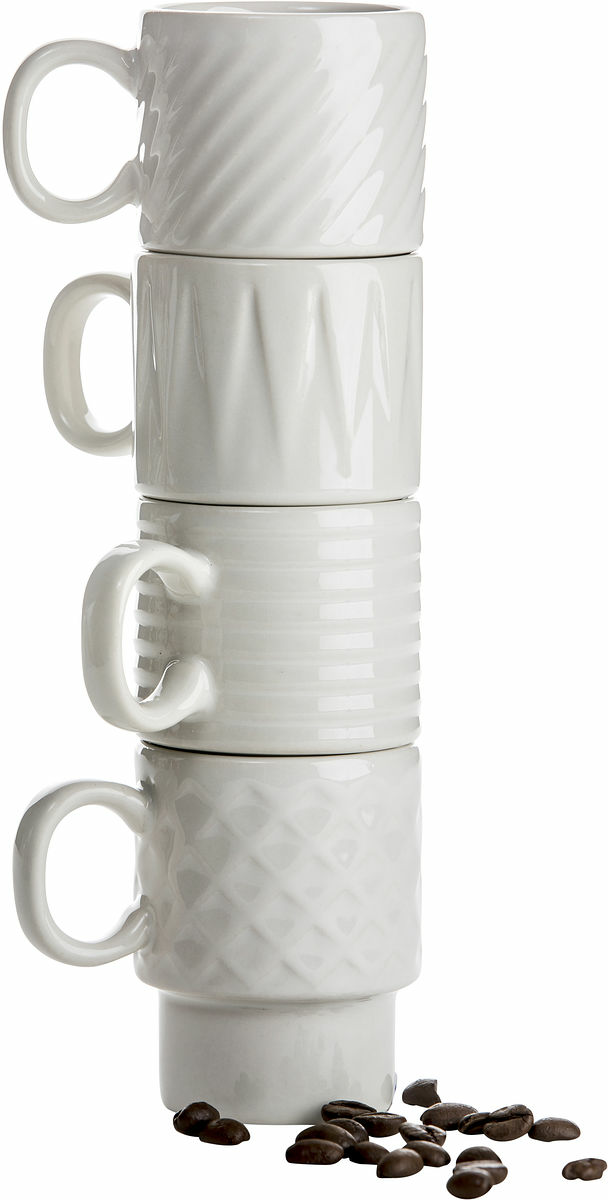 Espressomugg 4-pack med karakteristisk relief. Espressomuggen är en del i serien Coffee & More, framtagen av Sagaform i samarbete med designern Margot Marolo. Seriens design är en flört med 70-talets direkta, lekfulla och raka språk. Serien finns i olika delar, mönster och färger och gör sig allra bäst i en härlig mix av allt! Tål mikrovågsugn och maskindisk.