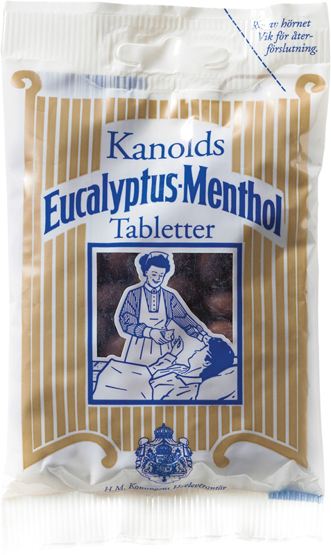 socker/sukker, glukossirap, aromer (eukalyptusolja, pepparmint-/pebermynteolie, mentol/menthol), färgämne/farvestof (E150c), vegetabiliska oljor (kokos, palm*), ytbehandlings-/overfladebehandlingsmiddel (karnaubavax/voks).