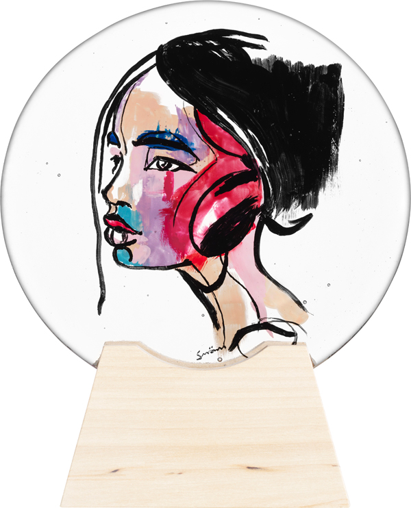 Med starka färger och kraftiga penseldrag på Kosta Boda manér har Sara gett uttryck för tre liv med olika erfarenheter, öden, framtider och drömmar.