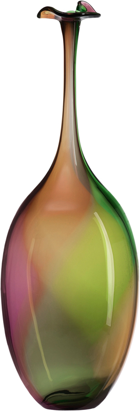 Flaskor i varma färger med runda magar och långa stolta halsar. Med stor hantverksskicklighet skapas unika färgkombinationer i mjuka former.