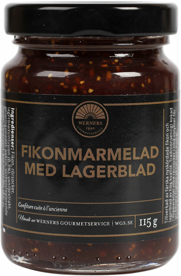 Fikon, rörsocker, lagerblad (0,3%), vanilj, geleringsmedel: pektin, surhetsreglerande medel: citronsyra. Kan innehålla spår av nötter och mjölk.